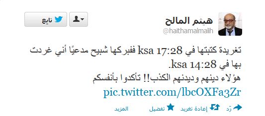 “This is a tweet that I wrote at KSA [Kingdom of Saudi Arabia] 17:28 [5:30 PM] and a shabbih [pro-regime thug] changed it, claiming that I tweeted it at KSA 14: 28 [2:30 PM].”