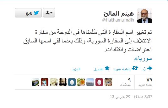 In a related move, Qatar handed over the Syrian embassy to the National Coalition, which held the name “The Embassy of the Syrian National Coalition.” Many opposition supporters expressed their anger at the fact the embassy does not carry Syria’s name, leading the Coalition to change its name. Haitham al-Malih reassured his supporters that this issue has been addressed.
