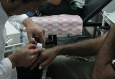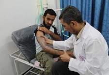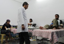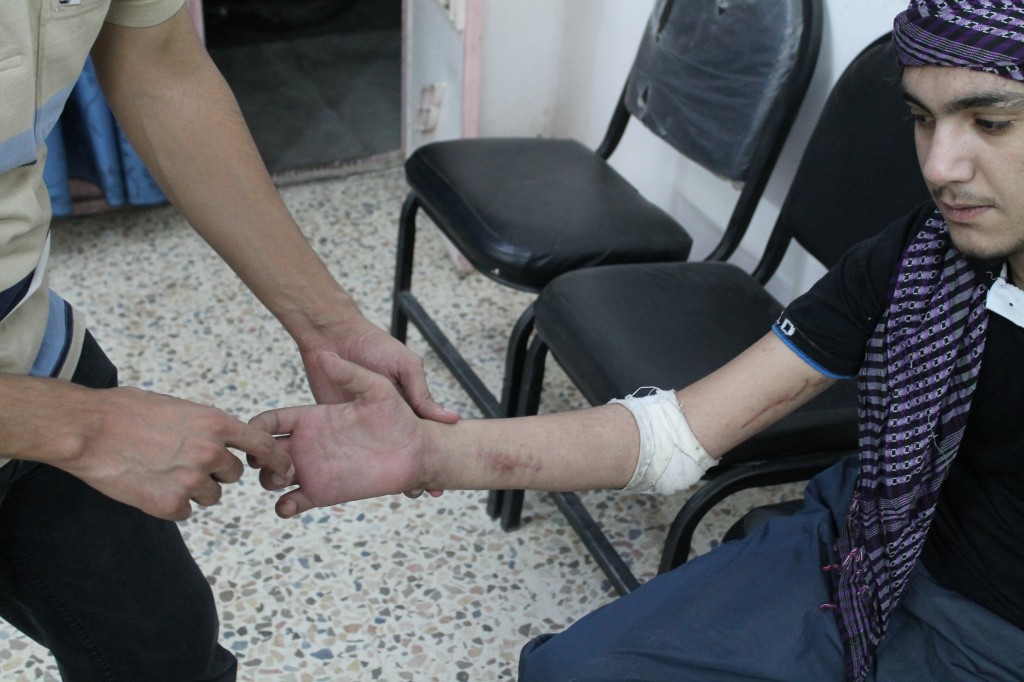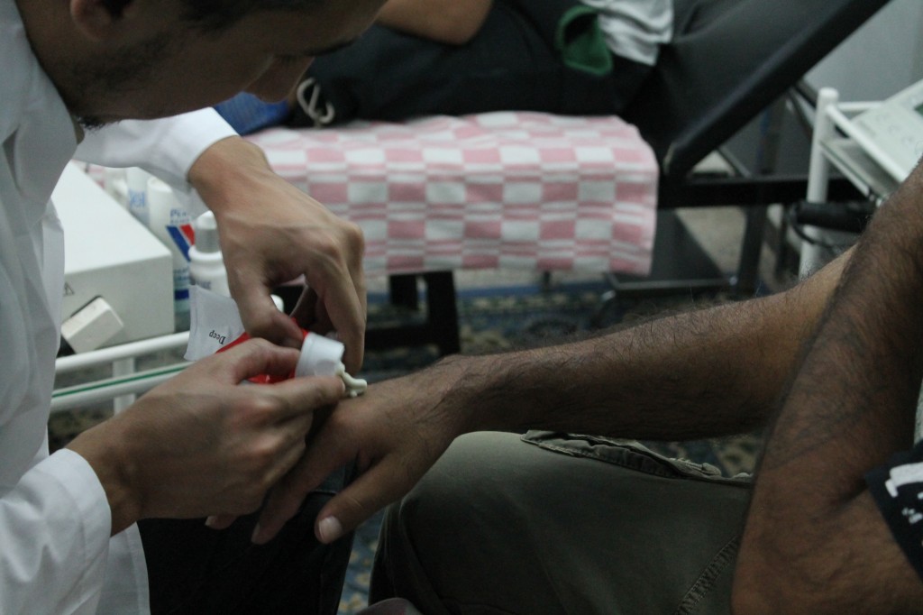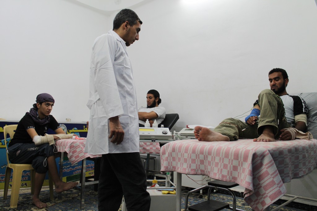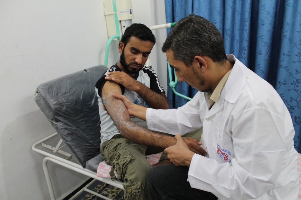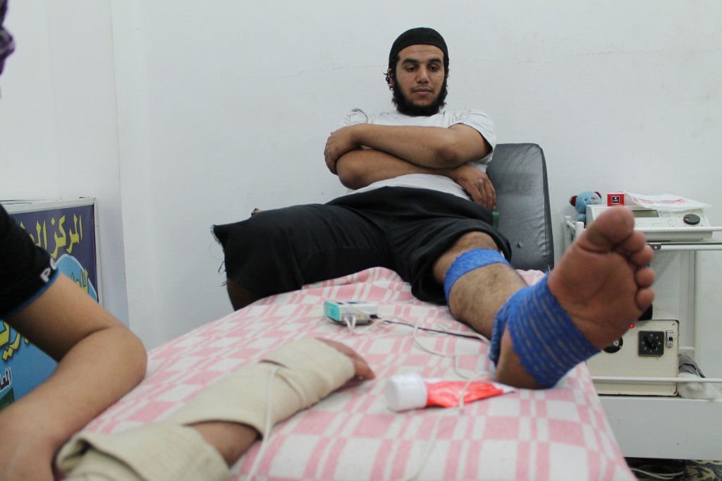 Mohammad al-Hayess offers help to a patient suffering from a leg injury.