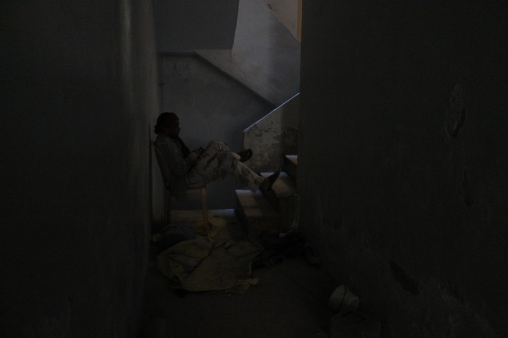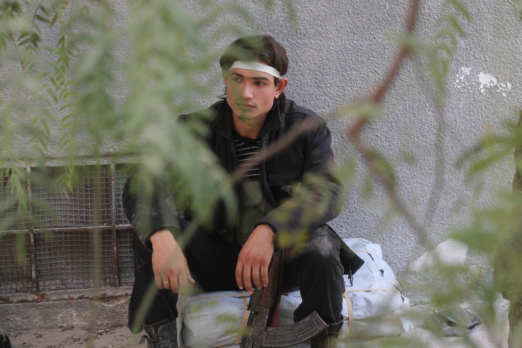 A fighter in the Free Syrian Army awaits orders in the Salah Al-Din neighbourhood to deploy to the Aathamiah neighbourhood, which is controlled by regime forces. October 10, 2013.