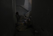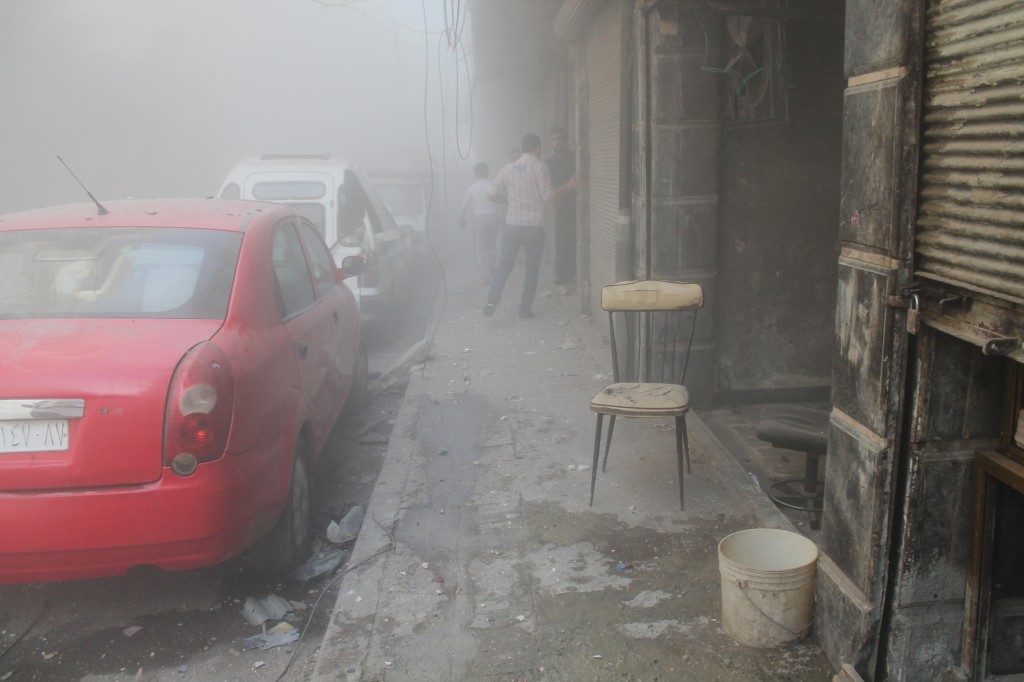 Residents in the Mashhad neighbourhood seek shelter in the doorways of buildings among billowing smoke from a recently dropped artillery shell. The shells are being fired from the “Artillery School” in the Rawasimah neighbourhood, headquarters of Air Force intelligence. The regime has not tried to infiltrate the Salah al-Din neighbourhood but has instead indiscriminately shelled it. October 10, 2013.
