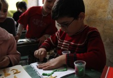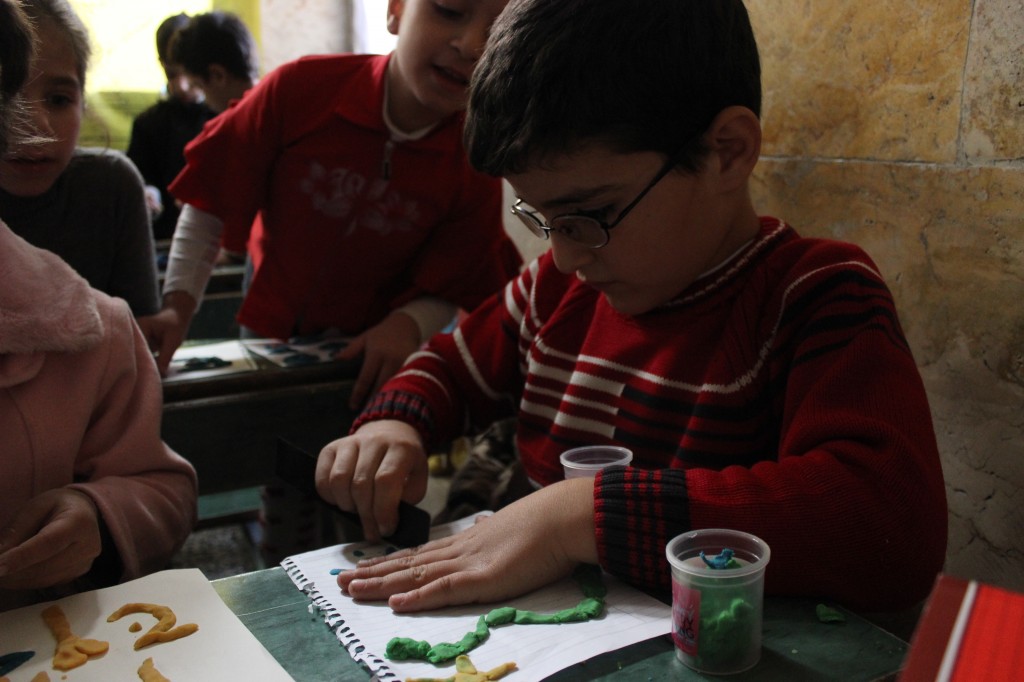Activists lead an activity to offer psychological support to the children at the Martyr Abdel Qader Shasho school in the Salah al-Din neighbourhood, which has witnessed intensified shelling recently. September 10, 2013.