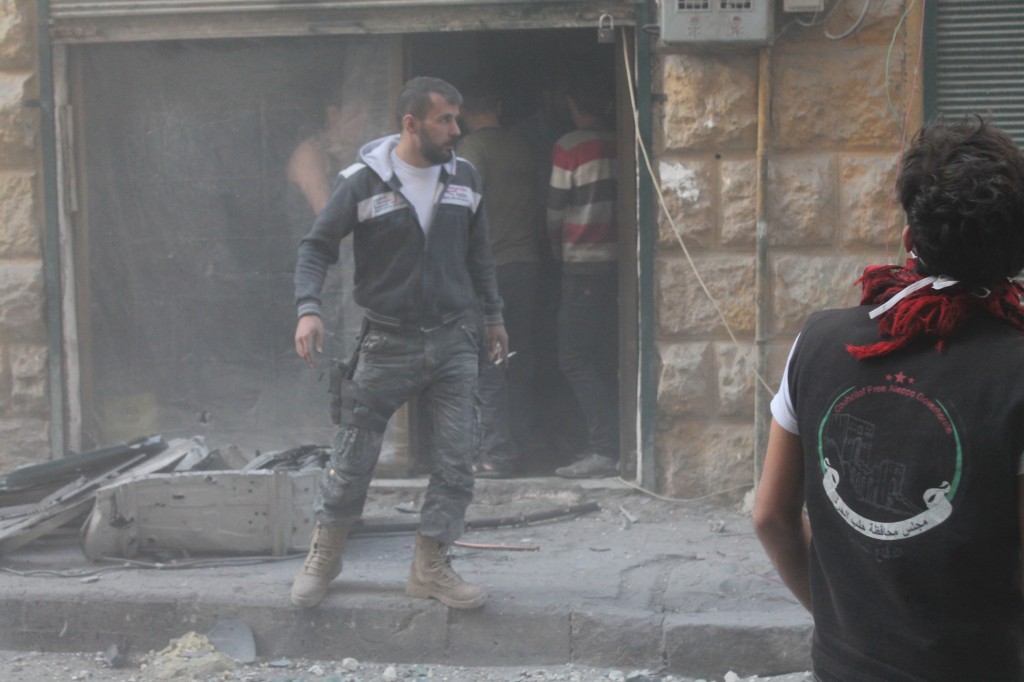 Paramedics and fighters from the Free Syrian Army enter a store in the Mashhad neighbourhood to rescue the injured and inspect the damage. A man and two children were wounded when shells exploded on the street. The man was transported to Turkey owing to his critical condition, while the two children escaped with minor injuries. October 10, 2013.