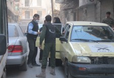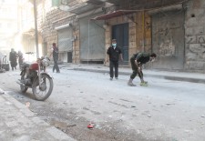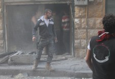 A group from the “Free Aleppo Governorate Council” leads a team of former firemen on a sweep of a street in the Mashhad neighbourhood about a half hour after the shelling. October 10, 2013.