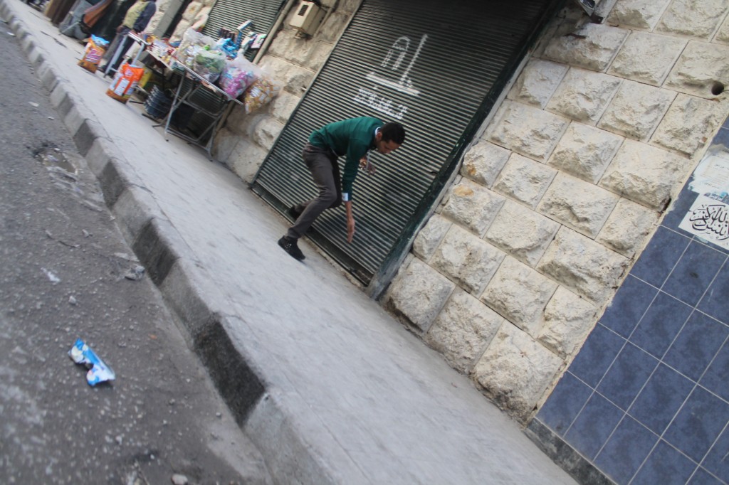 Last year, when the Bashar al-Assad’s regime began shelling neighbourhoods in Aleppo, any shell that fell on a residential neighbourhood would shut it down entirely. This man never closed his shop until a bomb fell nearby. October 10, 2013.